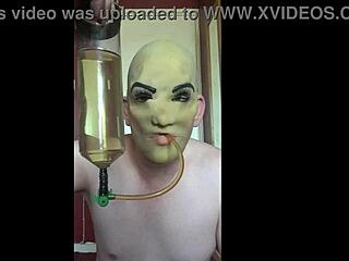 Masked brunette babe handles intense shovelling with gagging and choking elements in a fetish scenario.