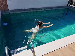 Latina Angelina de Miami na piscina mergulha no pauzão negro balançando a bunda