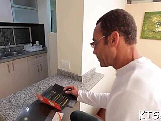 Skinny brunette shemale with glasses masturbating solo