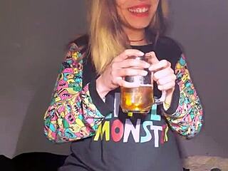 blonde student slut cuckolds friend with cumshot facial in lingerie outdoors