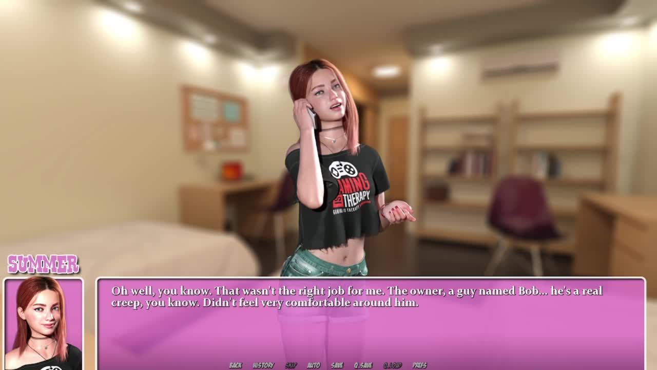 Tanned Natsuki feels aroused during striptease in hentai game episode 6.